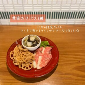 金曜日、皆さん今週もお疲れさまでした(๑>◡<๑)! 今回は、11月の限定タパスがちょっぴり 冬を感じるラインナップになったのでご紹介します!☺️ ・サクサク蓮根チップス ・長ネギと墨さきいかのマリネ ・サラミとカブのアリーニョ 冬の始まりを感じる今日この頃! お食事からも季節の移ろいを感じにきてくださいね!⛄️✴︎ 本日もお待ちしております(๑˃̵ᴗ˂̵)! \平日は19時までハッピーアワー/