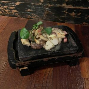 ジューシーなベーコンの旨みとエリンギのシャキッとした食感に、香ばしいガーリックバターがからんでやみつきのひと皿です。アツアツの鉄板の上に乗せてご提供致しますので、臨場感がある1品となっております。